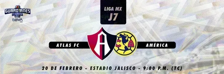 Atlas vs. América se enfrentarán el sábado 20 de febrero por la jornada 7 de la Liga MX. El duelo entre ambas escuadras está pactado a las 21:00 horas (hora del Centro de México) y tendrá lugar en el Estadio Jalisco.
