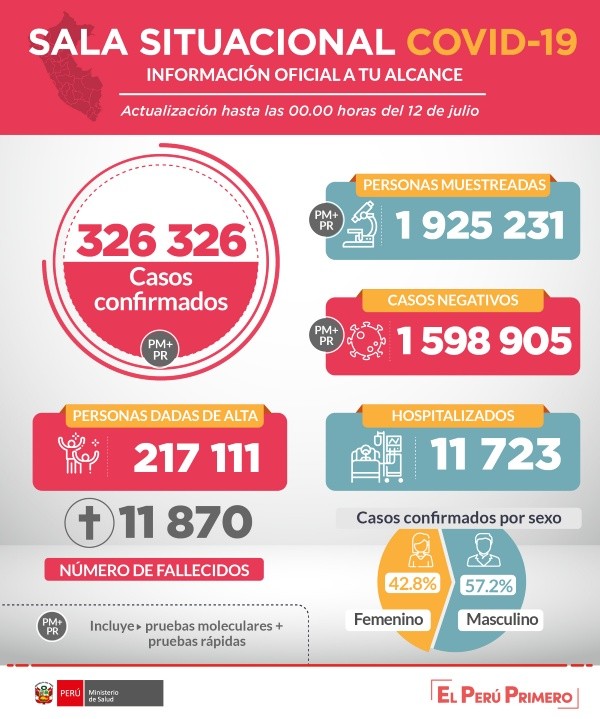 “A la fecha, se tienen 11,723 pacientes hospitalizados con Covid-19, de los cuales, 1,316 se encuentran en UCI con ventilación mecánica”, detallan también sobre la situación médica que ya tiene 217,111 altas. Así está el Perú a este 12 de julio ¡A seguir cuidándose!