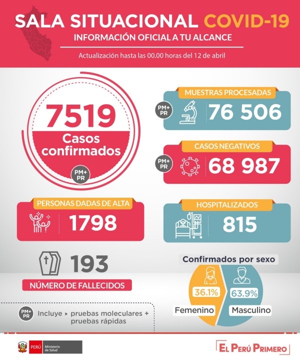 En esta oportunidad, la actualización fue cercana a las 3 de la tarde. Ahí, se ve que las pruebas ascendieron a 76 501 y de ellas, los positivos fueron 7 519. Los muertos ya son 193. Las altas, osea los curados, suman ya 1798, mientras los que todavía están hospitalizados son 815 pacientes.