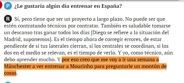 “Sí, me gustaría,pero tiene que ser un proyecto a largo plazo. No puede ser que estén contratando técnicos por contratar.Y yo, como técnico, aún debo aprender mucho. Por eso, creo que me voy a ir una semana a Manchester a vera Mourinho para preguntarle un montón de cosas”,respondió.