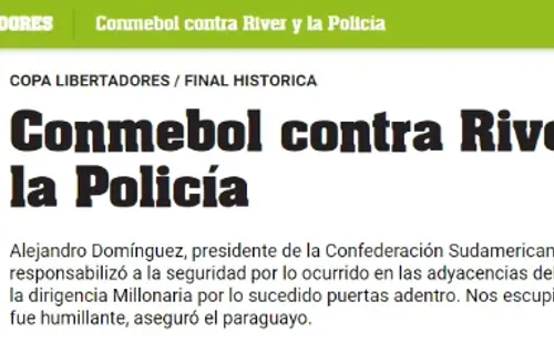 Sacándole responsabilidad por lo ocurrido a la casa madre del fútbol sudamericano, el dirigente soltó: “De la parte de la organización se previó todo. Pero nosotros solo podemos prever lo que va a ocurrir dentro del campo de juego y pedir la asistencia y colaboración de la policía o la seguridad nacional”. “Esto se le escapa a la responsabilidad de la Conmebol, porqueson hechos vandálicos que ocurrieron en la calle. Esa es una jurisdicción de la policía”, agregó.