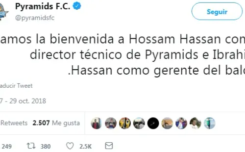 “Damos la bienvenida a los gemelos del fútbol egipcioHossam Hassancomo director técnico del clubPyramidseIbrahim Hassan”, redactó la escuadra de laLiga Premieregipcia.