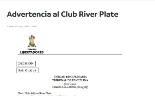 La Conmebol irrumpió en la tranquilidad que vive el Club Atlético River Plate con una advertencia para su director técnico Marcelo Gallardo. La misma fue por el incumplimiento de dos reglas que rigen en la Copa Libertadores y de repetir las faltas, podría ser suspendido por un encuentro.