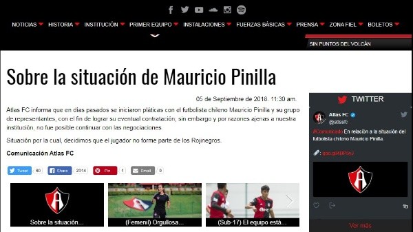 “Atlas FC informa que en días pasados se iniciaron pláticas con el futbolista chileno Mauricio Pinilla y su grupo de representantes, con el fin de lograr su eventual contratación; sin embargo y por razones ajenas a nuestra institución, no fue posible continuar con las negociaciones.