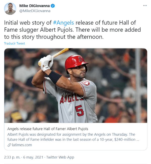 La tarde de este jueves, laMajor League Baseball (MLB)sufrió un golpe importante luego queLos Angeles Angelsanunciaran la salida del primera base dominicanoAlbert Pujols, luego de nueve temporadas y en medio del último año de su contrato, generando reacciones dentro de la franquicia.