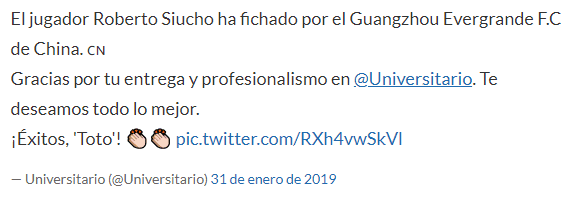 “El jugador Roberto Siucho ha fichado por el Guangzhou EvergrandeF.C de China. Gracias por tu entrega y profesionalismo en@Universitario. Te deseamos todo lo mejor”, escribió la cuenta oficial de Los Cremas.
