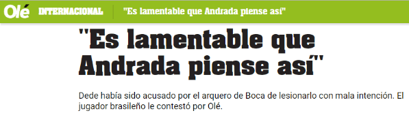 Ayer, en la cena anual solidaria deBoca, aEsteban Andradale preguntaron porDedé, quien le rompió la mandíbula de un cabezazo, y destacó la mala intención del rival.