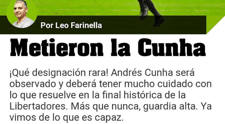 En elDiario Olé, Leonardo Farinelladejó entrever una mano negra de la Confederación Sudamericana contra el Millonario por la designación del árbitro uruguayo.
