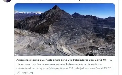 Antamina, por ejemplo, comunicó que ya se han contagiado 210 de sus trabajadores. Esta minera no detuvo sus actividades, sino solo las redujo. Entonces, el coronavirus hizo lo suyo. Obviamente, tras la información, surgieron las críticas. Hubo, de todas maneras, personas que se atrevieron a defender a la empresa minera y a la activida en general.