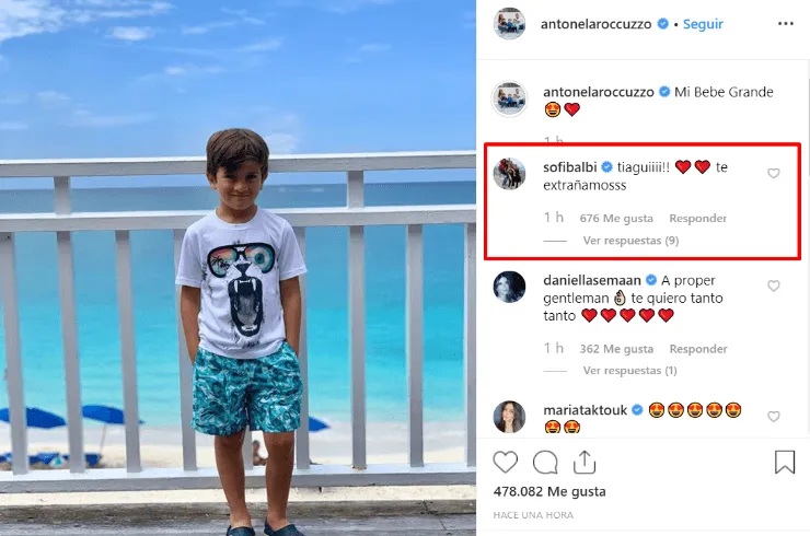 “Mi Bebe Grande”, escribió en la descripción de la misma. Apenas la subió, la mujer de Luis Suárez, Sofía Balbi, le dejó un comentario: “¡Tiaguiiii!! ¡Te extrañamosss!”.
