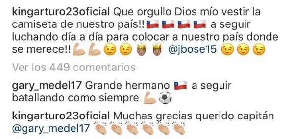 Después del cotejo, Arturo Vidal subió una foto a Instagram, la cual Gary Medel le respondió con un mensaje elogiándolo. Y claro, el volante de Bayern Munich le contestó: “Muchas gracias querido capitán”.
