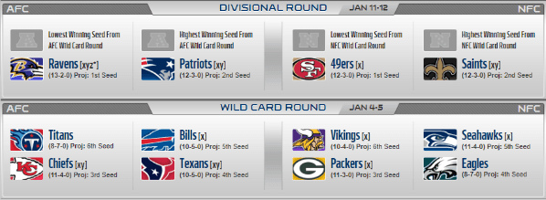En el fin de semana del 4 y 5 de enero, por la ronda previa a los choques divisonales, Titans iría ante Chiefs para definir al rival de Ravens mientras que Bills y Texans lucharían por enfrentar a Patriots.