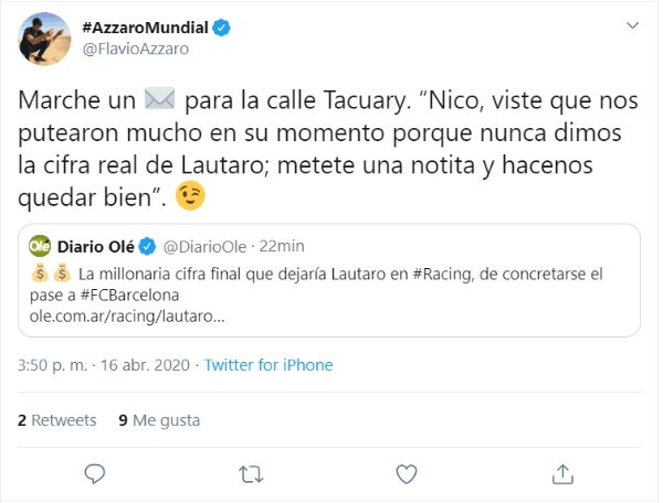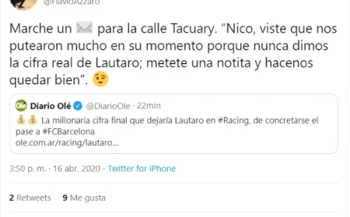 “Marche un sobre para la calle Tacuary. ‘Nico, viste que nos putearon mucho en su momento porque nunca dimos la cifra real de Lautaro; metete una notita y hacenos quedar bien'”, publicó Flavio citando un tuit.