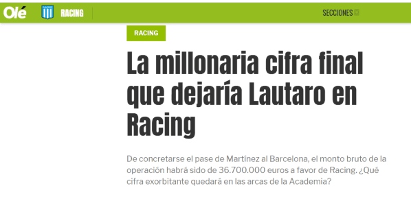 En esta ocasión, no le gustó nada una nota que publicó Diario Olé titulada: “La millonaria cifra final que dejaría Lautaro en Racing”, hablando sobre el dinero que podría recibir el club de Avellaneda si el Inter vende a Martínez.