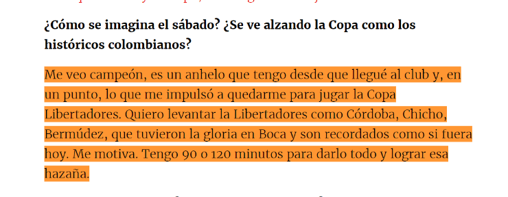 “Me veo campeón, es un anhelo que tengo desde que llegué al club y, en un punto, es lo que me impulsó a quedarme en Boca.Quiero levantar la Libertadores como Córdoba, ChichoSerna o Bermúdez, que tuvieron la gloria en Boca y son recordados hasta el día de hoy. Me motiva. Tengo 90 o 120 minutos para darlo todo y lograr esa hazaña”. ¡Está muy confiado!