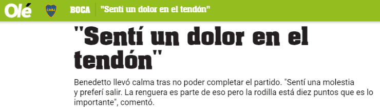 Según Olé, el jugador manifestó que sufrió “un dolor en el tendón”, descartando así algún problema con la rodilla involucrada en la lesión que pareció anteriormente. De igual manera, la participación del Pipa en el cruce ante Alvaradopor Copa Argentina está más que en duda, ya que desde el Xeneizese evalúa no apresurar su recuperación e ir llevándola de a poco.