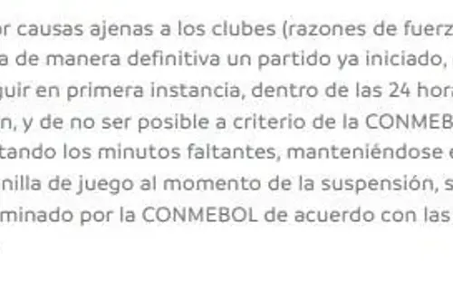 Si el partido llegara a iniciarse, la Conmebol exige que el encuentro se juegue, en primera instancia, en las primeras 24 horas.