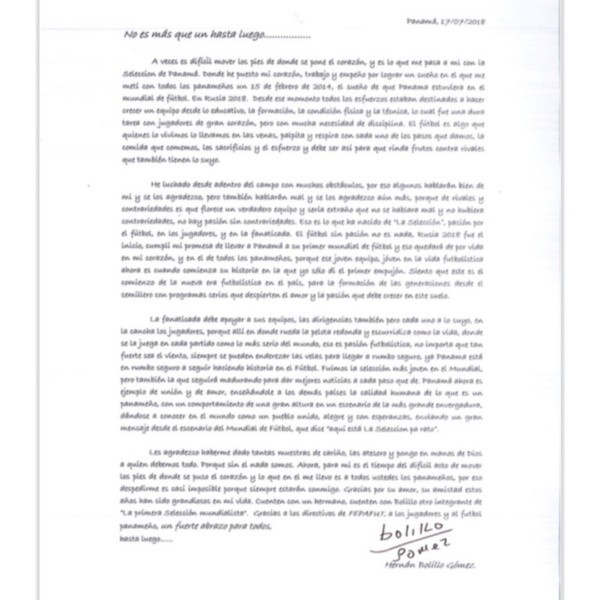 “No es más que un hasta luego”. Con esta emotiva frase,Gómez inició su carta de despedida y argumenta que “a veces, es difícil mover los pies de donde se pone el corazón y es lo que me pasa a mi con mi selección de Panamá”.