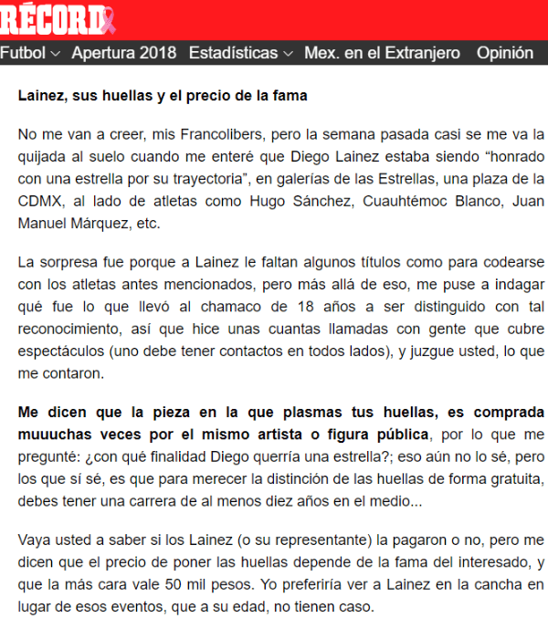En esta ocasión, el Francotirador subió una nota que revela que Diego Lainez podría haber pagado por el premio que le otorgó la semana pasada el América, en la que reconoce “su trayectoria”. El periodista afirmó que se juntó con personajes del mundo del espectáculo y estos le comentaron que para tener tal distinción de forma gratuita hay que tener, como mínimo, diez años de carrera.
