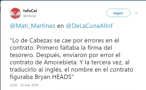 “Lo de Cabezas se cae por errores en el contrato. Primero faltaba la firma del tesorero. Después, enviaron por error el contrato de (Fernando)Amorebieta. Y la tercera vez, al traducirlo al inglés, el nombre en el contrato figuraba Bryan Heads”, contó el periodista Matías Martínez. ¡Un papelón!