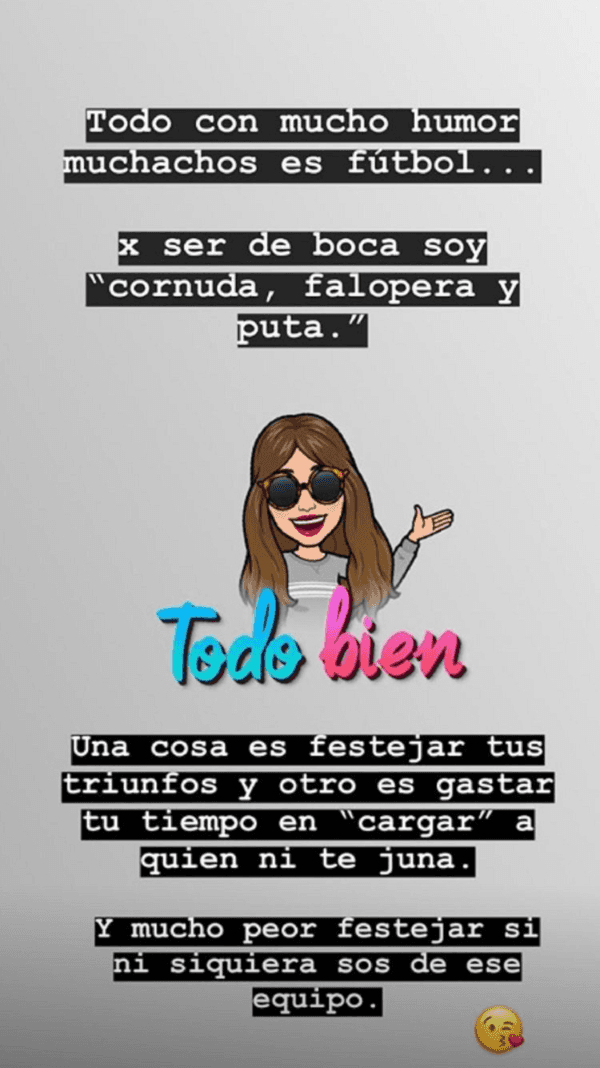 Instantes después, la diva publicó una historia en la que se descargó: “Todo con mucho humor muchachos es fútbol… x ser de boca soy “cornuda, falopera y pu**”.