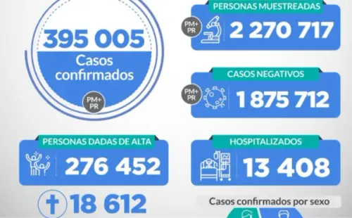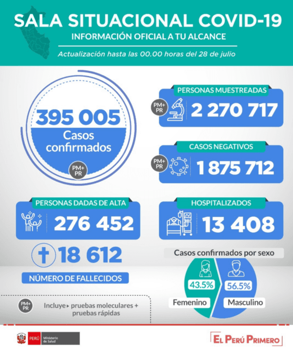 Las de este martes 28 de julio, sacadas cerca de las 7 de la noche, informaron que de las2’270,717 personas muestreadas,395,005 casos resultaron positivos. Las muertes llegaron a18,612, o sea 194 más en las últimas 24 horas.