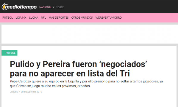 Este es el caso de José Cardozo, que, según Mediotiempo, pidió que Jair Pereiray AlanPulido no vayan con elTri. En la idea de Ricardo Ferreti, entrenador del combinado azteca, ambos iban a integrarel plantel para estos dos partidos amistosos, ante Costa Rica y Chile.