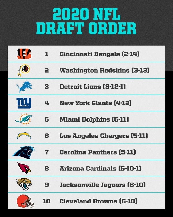 Los Cincinnati Bengals tienen la primera selección, seguidos de los Washington Redskins, Detroit Lions, New York Giants y Miami Dolphins.