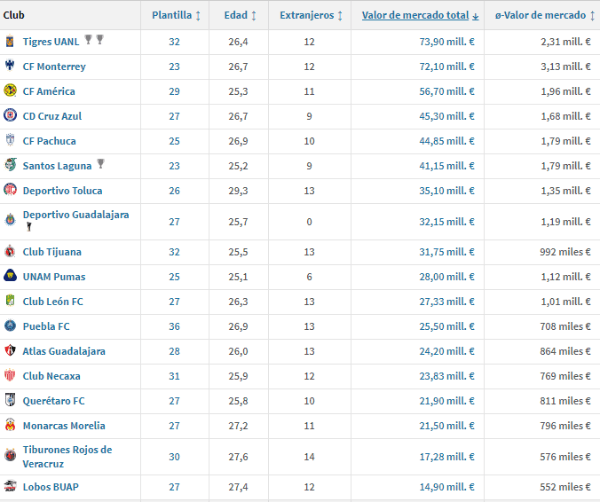 El listado total de los valores de todas las plantillas de la Liga MX: