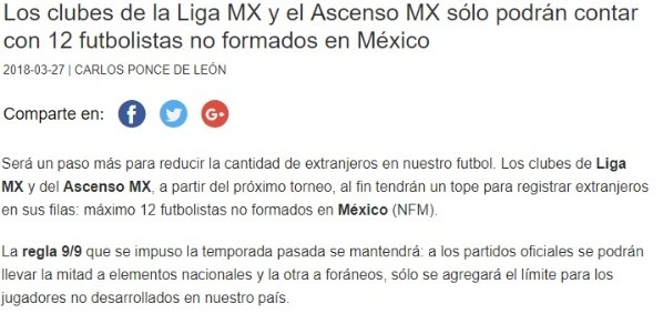 Según la citada publicación, la norma del 9/9 se mantiene. La misma consiste en que las citaciones deben tener 9 jugadores mexicanos y 9 foráneos. Pero en un plantel profesional el límite sera de 12 NFM, mientras que en la actualidad no había prohibición alguna de mantener los foráneos que se quisieran en un plantel.