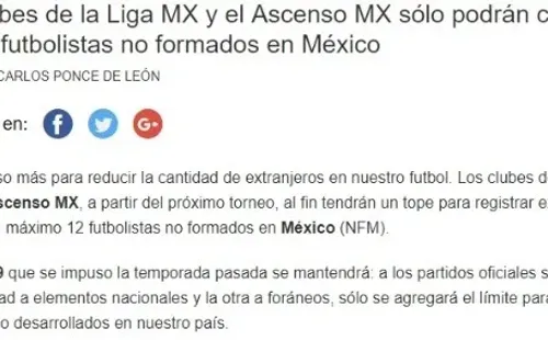 Está por darse otro paso en la reducción de la cantidad de jugadores importados en el fútbol mexicano, luego de que se diera a conocer la limitante que podría darse a partir del próximo torneo. Según consignó Récord, desde la 2018-19 los clubes de la Liga MX y el Ascenso MX podrán tener solo 12 jugadores no formados en México (NFM).