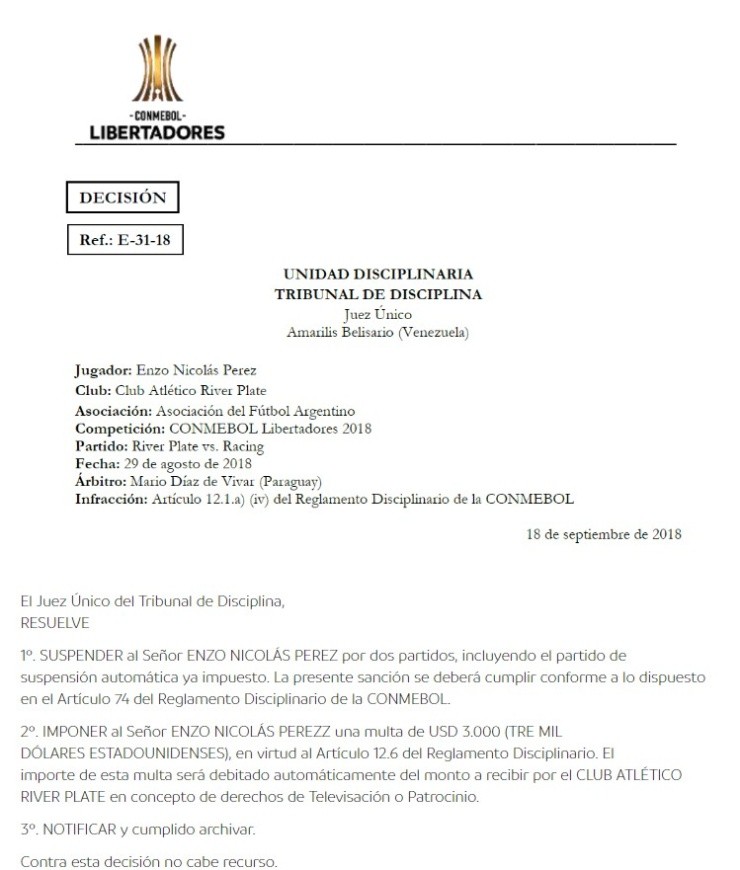 Además de una multa económica de tres mil dólares, el jugador de Mendozano podrá estar presente en los próximos dos compromisos de River por Libertadores, por lo que no estará disponible para la serie ante Independiente.