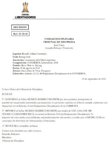 En esta oportunidad, Conmebolhizo oficial un rato después la pena de castigo que el jugador de Racing recibirá.