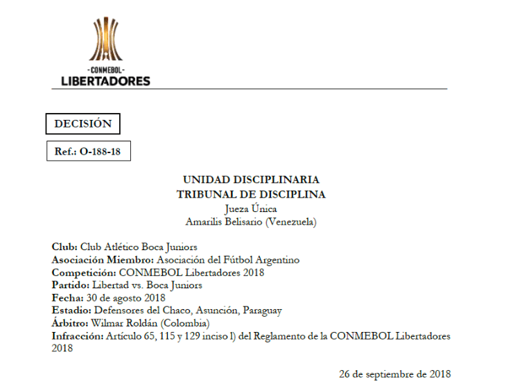 Por el cruce correspondiente a los octavos de final de la Copa Libertadores vs Libertad de Paraguay, Boca fue sancionado por no cumplir con tres artículos estipulados en el reglamento de Conmebol.