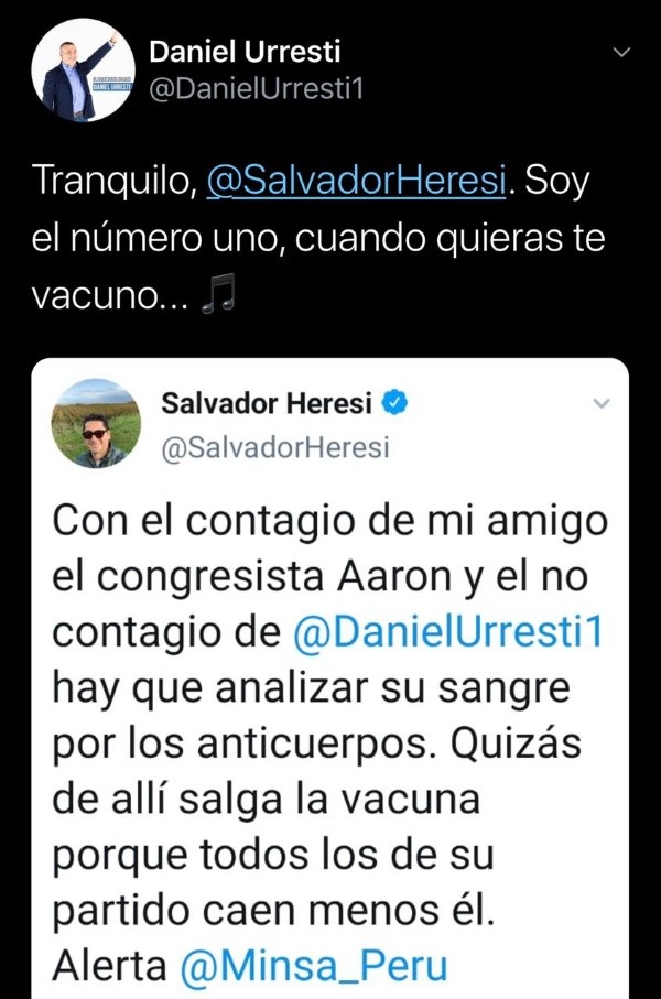 Por ello, Salvador Heresi, exparlamentario y exministro peruano, se quiso burlar del congresista más votado: “Con el contagio de mi amigo el congresita Aaron y el no contagio de Daniel Urresti hay que analizar su sangre por los anticuerpos”. “Quizás salga la vacuna porque todos caen menos él”, continuó.