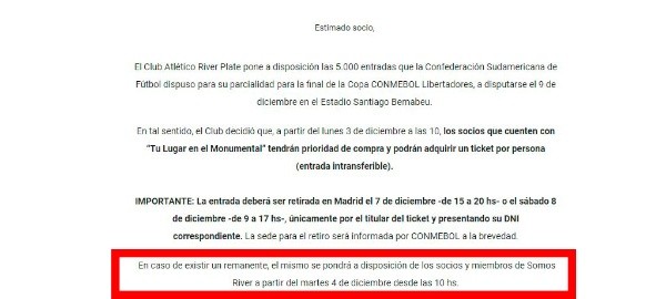 En caso de haber remanentes, informaron que las venderían al día siguiente a socios y gente de la comunidad “Somos River”. Y sí, hubo. La página no colapsó, las entradas no se agotaron y hoy sigue la venta.