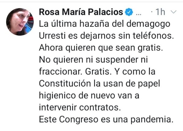 “La última hazaña del demagogo Urresti es dejarnos sin teléfonos. Ahora quieren que sean gratis. No quieren ni suspender ni fraccionar. Gratis. Y como la Constitución la usan de papel higienico de nuevo van a intervenir contratos. Este Congreso es una pandemia”, tiró la periodista. “Los que votaron para no ser Venezuela ahí tienen a Urresti. Su esquema económico es el mismo de Chávez y Maduro. Y si los dejan a ese desastre vamos. Los que ya lo vivimos lo reconocemos a la primera. Todo gratis hoy para que mañana no exista”, detalló después en una típica venezolanización de cualquier reclamo popular.