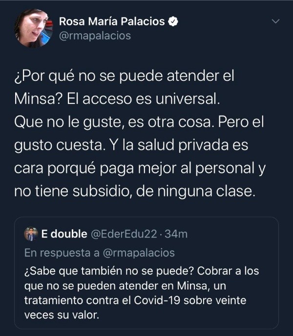 Así también aparecieron quienes defendieron el accionar de estas empresas. Rosa María Palacios, quien en la pandemia se mostró en contra por ejemplo de los derechos a los trabajadores del hogar, se manifestó. Hay que recordar que esta comunicadora ya había apoyado el cobro de las pruebas diciendo que “el fin del lucro mueve al mundo”, frase que terminó destacando el Washington Post para entender lo que pasaba en el país.