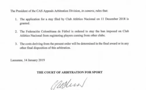 Atlético Nacional informa que a primera hora de la mañana de hoy lunes 14 de enero, recibió comunicación oficial del Tribunal de Arbitramento del Deporte, TAS que le otorgó la medida cautelar a la Institución Verdolaga y ordenó la suspensión provisional de la ejecución de la decisión apelada, lo que posibilita la inscripción de jugadores nuevos provenientes de terceros equipos.