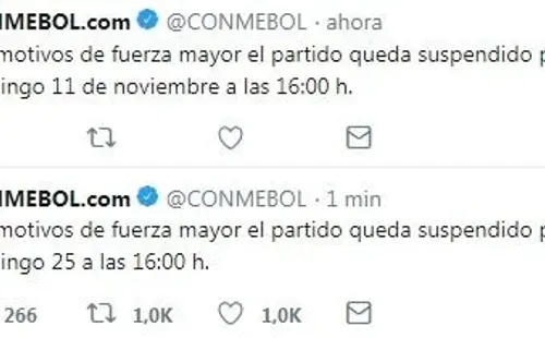 Y, instantes después, el mismo organismo rector del fútbol en Sudamérica utilizó su cuenta oficial de Twitter para anunciar la reprogramación del compromiso. Pero cometió un auténtico blooper.