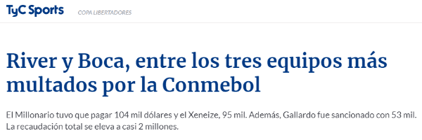 Según detalló TyC Sports, Rivery Boca, los dos finalistas de la actual edición de la Libertadores, fueron de los clubes que más tuvieron que pagar por romper las normas en más de una ocasión.