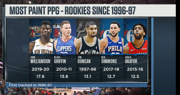 De hecho, el ex de la Universidad de Duke se ha convertido en el novato más dominante en la pintura en la historia moderna de la liga, promediandeo 17.6 de sus 24.9 puntos en el área restringida.