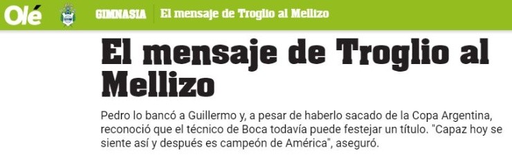 Según detalló Olé, Pedro Troglio, entrenador del Lobo, le dejó un mensaje al Mellizo: “A Guille le queda la posibilidad de pasar a las semifinales de la Copa.Capaz hoy se siente así y después es campeón de América. El fútbol tiene esto de fantástico”.