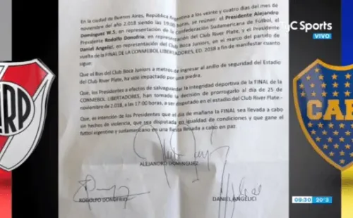 TyC Sports difundió una imagen en la que se puede apreciar el documento que los presidentes de River, Boca y Conmebol firmaron en la tarde noche del pasado sábado, luego del bochorno ocurrido que provocó la suspensión del cruce.