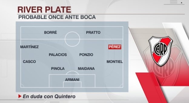 Según detalló ESPN, Riversaltaría a La Bombonera formando con Franco Armani; GonzaloMontiel, Jonatan Maidana, Javier Pinola, Milton Casco; EnzoPérez, Leonardo Ponzio, Exequiel Palacios, Gonzalo Martínez; Lucas Pratto y Rafael Borré.