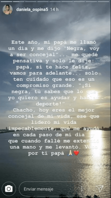 Daniela contó en una historia en su cuenta de Instagram, que su padre había soñado en ser concejal de Medellín, y que estuvo cerca de cumplirlo, ya el señor Hernán logró ser precandidato: “Este año, mi papá me llamó un día y me dijo: ‘Negra, voy a ser concejal’. Me quedé pensativa y solo le dije: ‘Papá, si te hace feliz, vamos para adelante… Solo ten cuidado que eso es un compromiso grande’, dijo la modelo.