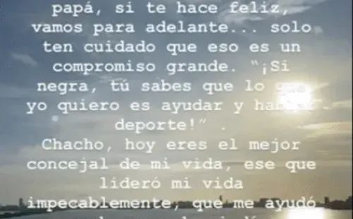 ‘’Sí, negra, tú sabes que lo que yo quiero es ayudar y hablar de deporte,” fue la respuesta del señor Hernán. Es por esto que Daniela concluyó su mensaje con una dedicación a su padre: ”Chacho, hoy eres el mejor concejal de mi vida, ese que lideró mi vida impecablemente, que me ayudó en cada paso de mi día y que cuando fallé me extendió la mano y me levantó. Voto por ti, papá”, concluyó la empresaria.