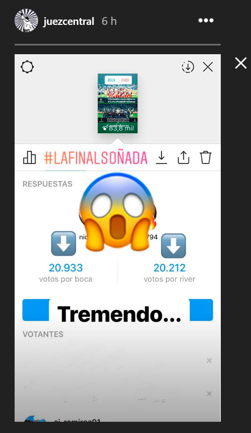 EnTyCSportsy la página de Instagram deJuez Central,Boca saca una pequeña ventaja sobre Rivermientras que enBolavip,elMillonariohace lo propio con elxeneize.