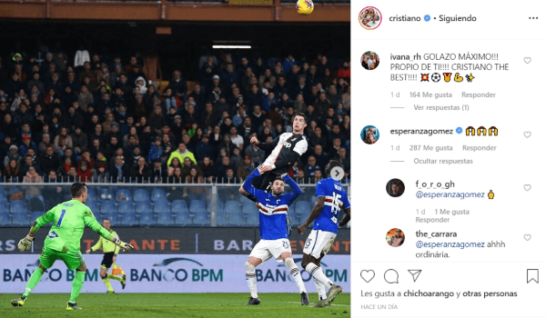 Y entre los comentarios de esas publicaciones en Instagram aparecieron grandes personalidades del fútbol y la farándula para felicitar al astro portugués por su golazo, pero uno de ellos no dejó de causar curiosidad que fue el de Esperanza Gómez.