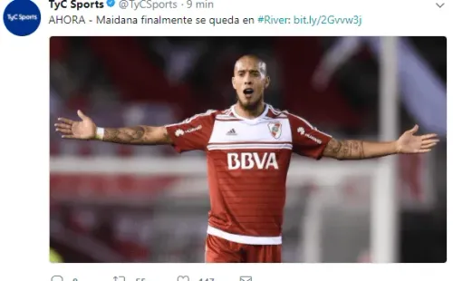 Ayer, TyC Sport informó que Jonatan Maidana se iba de River porque continuaba su carrera en México, en Toluca.